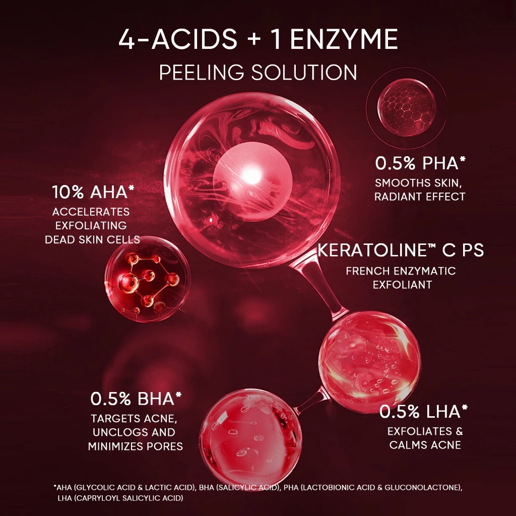 12% AHA BHA PHA LHA Peeling Solution Peeling solution with 10% AHA, 1% BHA, 0.5% PHA and 0.5% LHA, the maximum concentration for effective result. Formulated with the best Glycolic acid from United States, Chemours, potent and works efficiently with the signature tingling sensation yet gentle to use. Skin feels softer and smoother after only 60 seconds of use. After 8 hours, skin visibly looks brighter, pores look minimized, and blackheads are reduced. Equipped with Quadro Acids Technology that works simultaneously and deeply for peak exfoliation result and natural extracts for antioxidant and natural coloring. Suitable for all skin types, not recommended for pregnant and breastfeeding mothers.