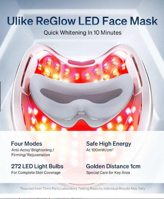 Experience professional LED light therapy at home with the Ulike ReGlow LED Face Mask — designed to deliver visible improvements in glow, acne control, fine lines, dark spots, and overall skin texture within 14 days.