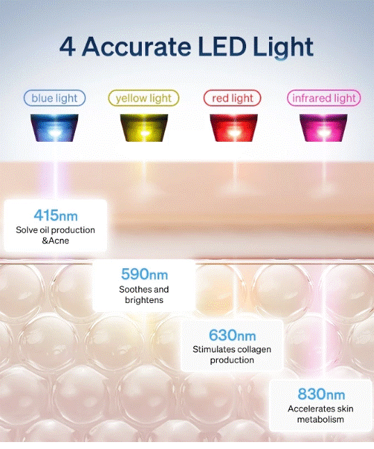 ✨ Red Light (Anti-Aging) — boosts collagen, reduces wrinkles 💙 Blue Light (Anti-Acne) — kills acne-causing bacteria 💚 Green Light (Pigmentation Control) — fades dark spots 💛 Yellow Light (Brightening) — improves dullness 💜 Purple Light (Repair) — calms redness 🤍 White Light (Rejuvenation) — promotes deep skin renewal 💗 Cyan Light (Hydration Boost) — balances moisture
